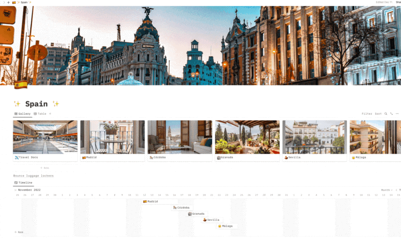 As an example, a few years back I organized myself in a meaningful way for a two-week, five-city solo travel through Spain. As someone who has never traveled out of the USA, I loved that my Notion was there every step of the way to remind me where my Airbnbs were, sights I wanted to see, and Spanish phrases I needed to remember to not stick out…as much.
